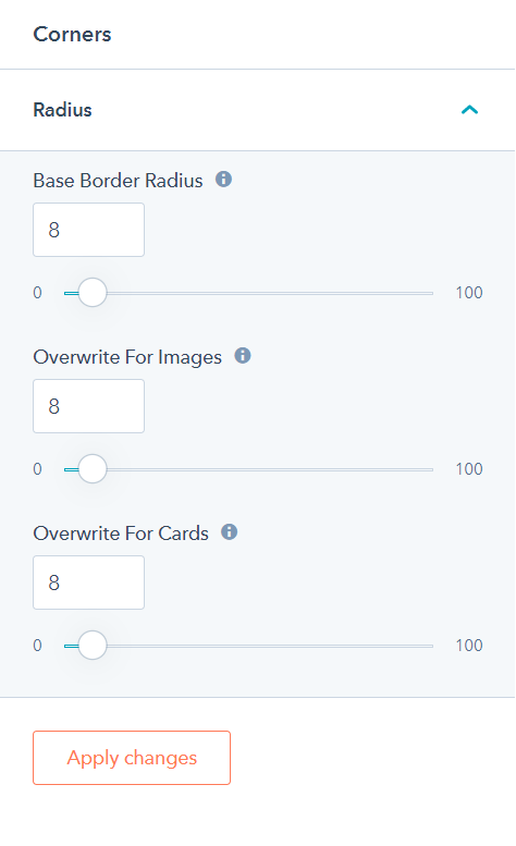 Set the base border radius of cards,buttons,images etc globally. You can overwrit the radius of images,cards etc individually too.