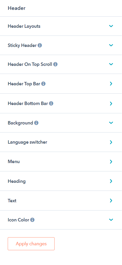 Enable or disable sticky header, header on top scroll, header top bar, header bottom bar, choose top or bottom header background color.